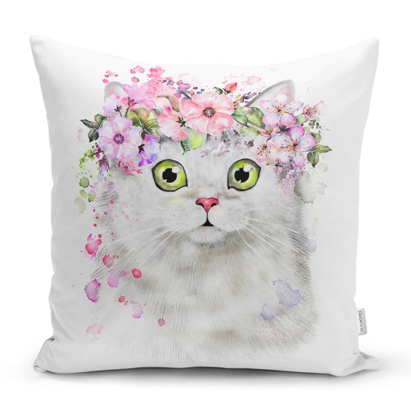 Çiçekli Kedi Motifli Dijital Baskılı Modern Yastık Kırlent Kılıfı