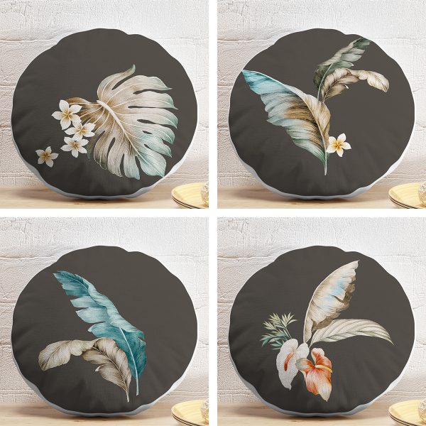 4’lü Koyu Zeminli Tüy Motifli Dijital Baskılı Modern Yuvarlak Yastık Kırlent Kılıf Seti
