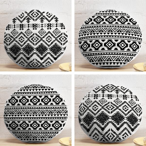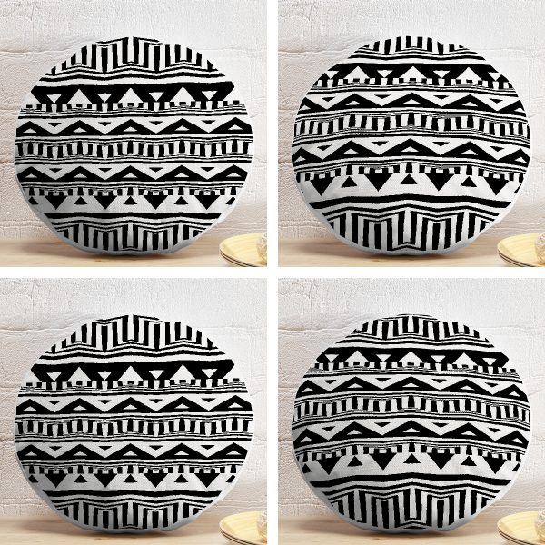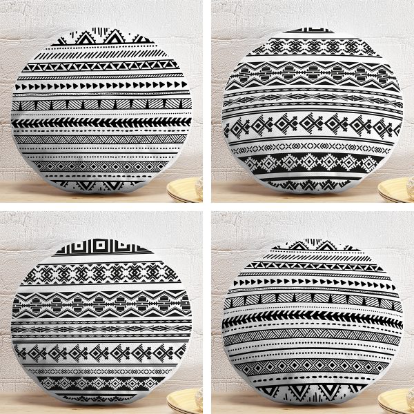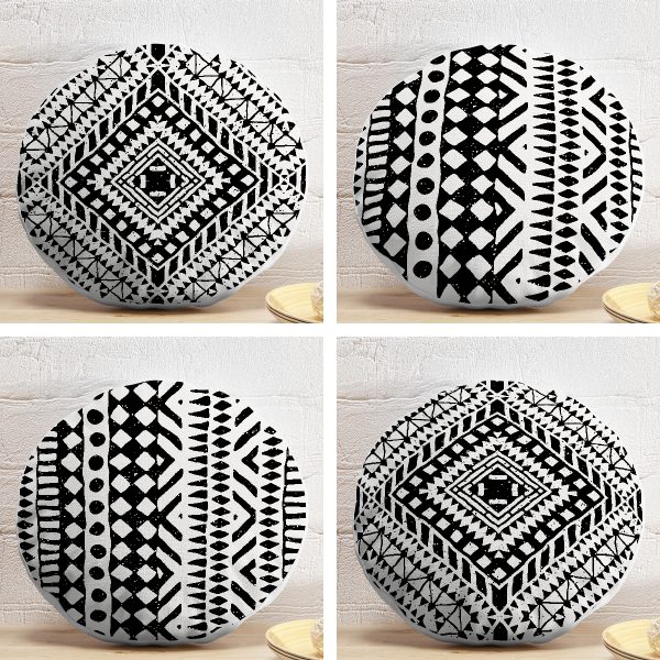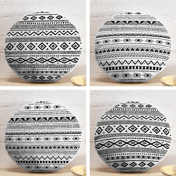 4’lü Siyah Beyaz Etnik Geometrik Çizimli Dijital Baskılı Modern Yuvarlak Yastık Kırlent Kılıf Seti