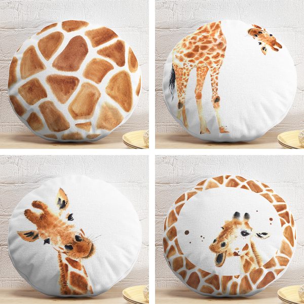 4’lü Özel Çizim Zürafa Tasarımlı Dijital Baskılı Modern Yuvarlak Yastık Kırlent Kılıf Seti