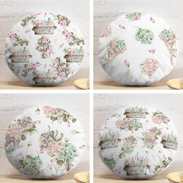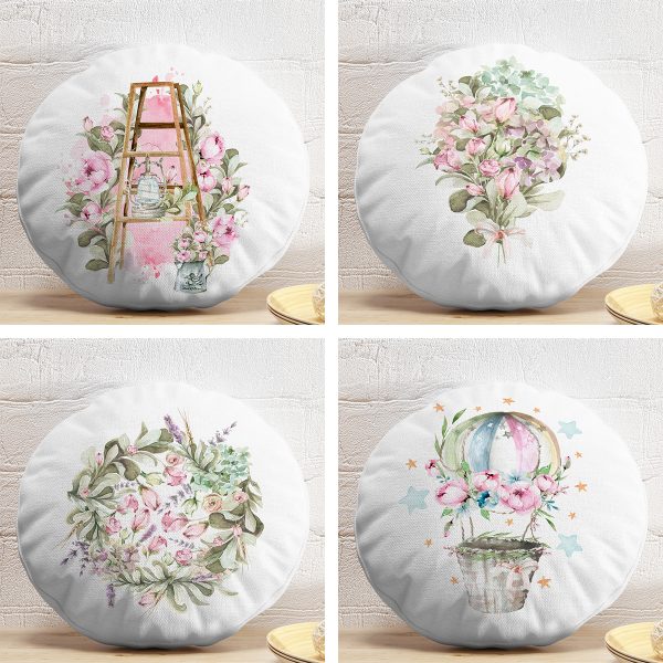 4’lü Çiçek Buketleri Tasarımlı Dijital Baskılı Modern Yuvarlak Yastık Kırlent Kılıf Seti