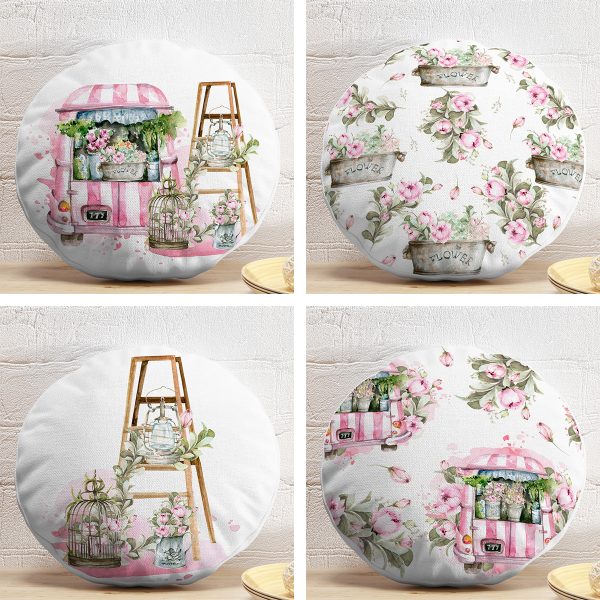 4’lü Çiçek Arabası Özel Tasarım Dijital Baskılı Modern Yuvarlak Yastık Kırlent Kılıf Seti