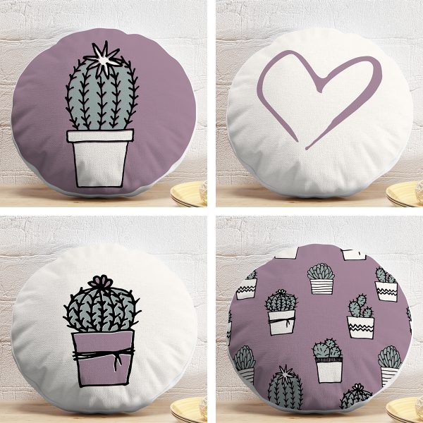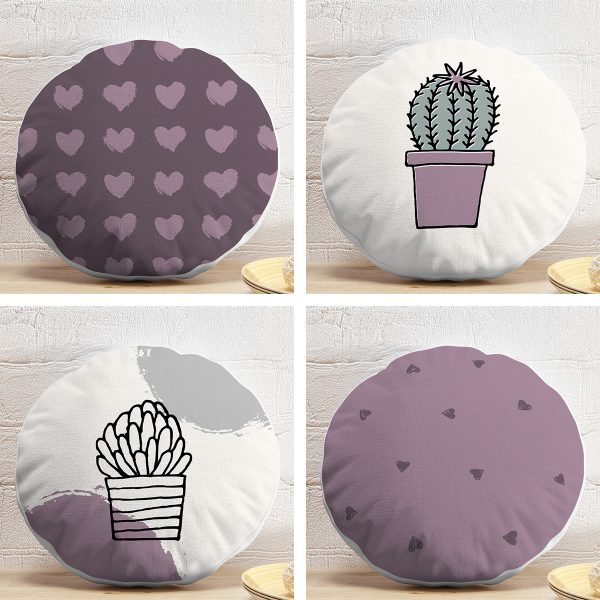 4’lü Kalp & Kaktüs Özel Tasarım Dijital Baskılı Modern Yuvarlak Yastık Kırlent Kılıf Seti