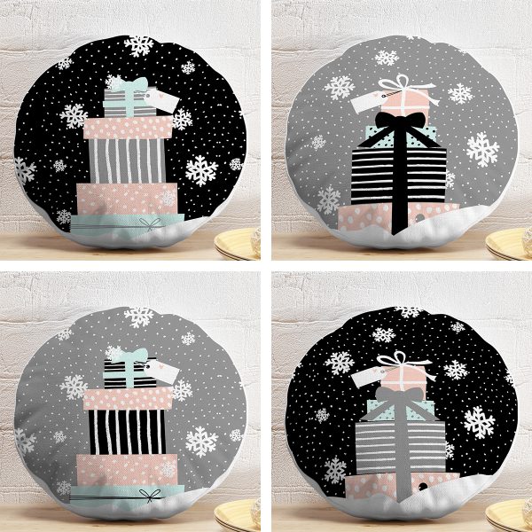 4’lü Siyah & Gri Hediye Paketleri Yılbaşı Temalı Dijital Baskılı Yuvarlak Yastık Kırlent Kılıf Seti