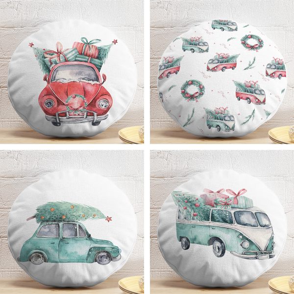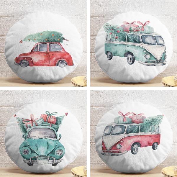 4’lü Çam Ağaçlı Araba Desenli Dijital Baskılı Modern Yuvarlak Yastık Kırlent Kılıf Seti