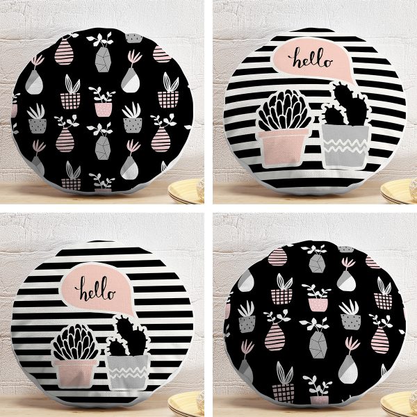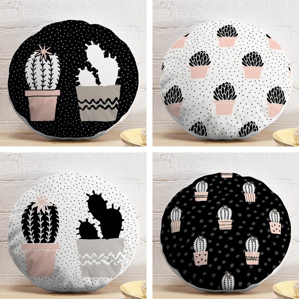 4’lü Siyah Beyaz Zemin Kaktüs Çizimli Dijital Baskılı Modern Yuvarlak Yastık Kırlent Kılıf Seti