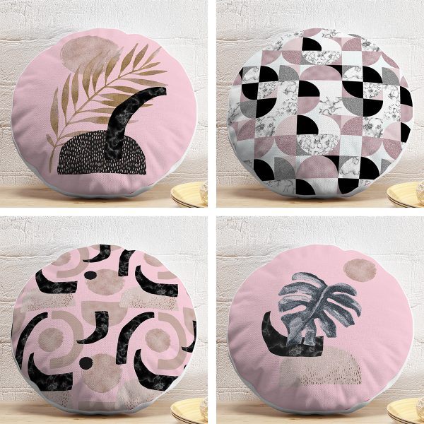 4’lü Pembe Zeminde Soyut Çizim Tasarımlı Modern Dijital Baskılı Yuvarlak Yastık Kırlent Kılıf Seti