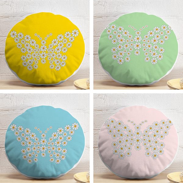 4’lü Renkli Zemin Papatya Kelebek Özel Tasarımlı Dijital Baskılı Yuvarlak Yastık Kırlent Kılıf Seti