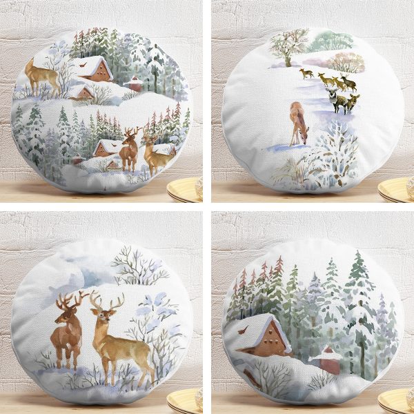 4’lü Geyikli Bağ Evi Kış Temalı Dijital Baskılı Modern Yuvarlak Yastık Kırlent Kılıf Seti
