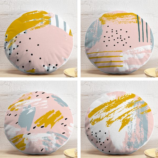 4’lü Sarı Ve Pembe Sulu Boya Fırça Darbeli Dekoratif Yuvarlak Yastık Kırlent Kılıf Seti