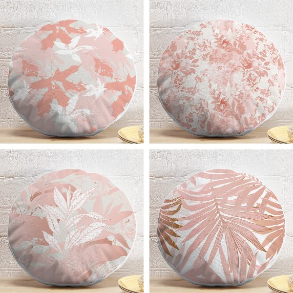 4’lü Beyaz Zeminde Pembe Yaprak Çizimli Dekoratif Dijital Baskılı Yuvarlak Yastık Kırlent Kılıf Seti