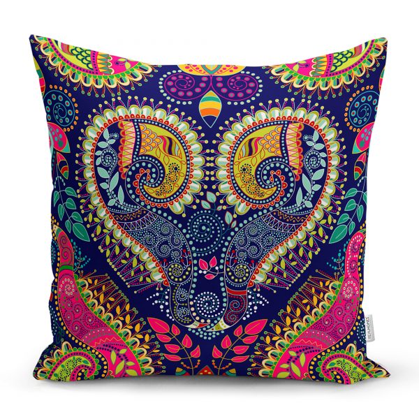 Realhomes Lacivert Zeminli Etnik Motifler Dijital Baskılı Modern Yastık Kırlent Kılıfı
