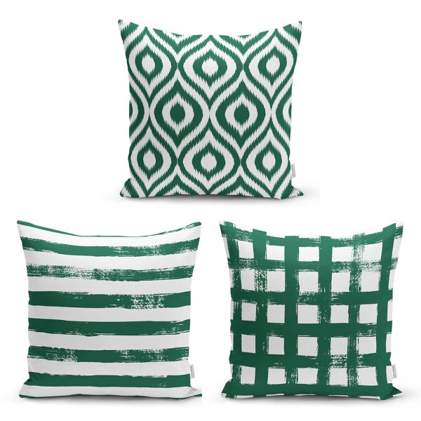 RealHomes Özel Tasarım Yeşil İkat Desen Motifli Dijital Baskılı 3’Lü Modern Kırlent Kılıf Seti