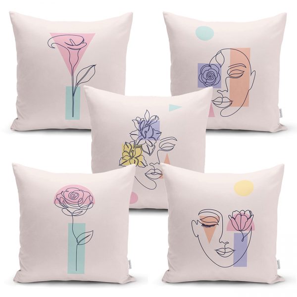 Beyaz Zeminde Gül Ve Portre Tasarımlı 5’Li Kırlent Kılıf Seti