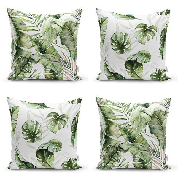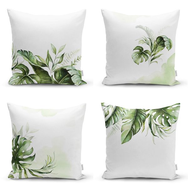 4’lü Yeşil Egzotik Yaprak Tasarımlı Dijital Baskılı Modern Kırlent Kılıfı Seti