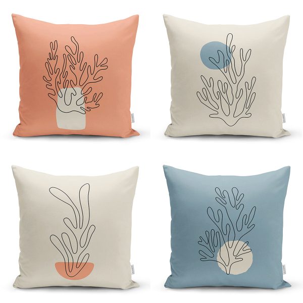 4’lü Renkli Zemin Deniz Yosunu Çizimli Dijital Baskılı Modern Kırlent Kılıfı Seti