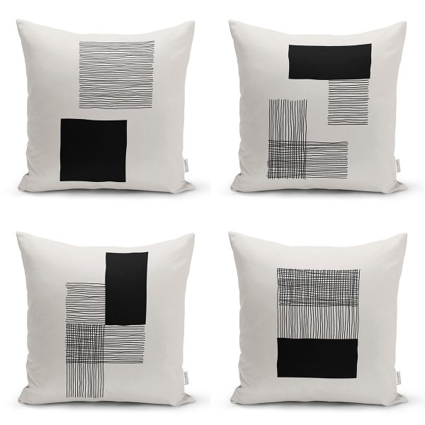Siyah Beyaz Geometrik Çizimler Özel Tasarım Dijital Baskılı Dekoratif 4’lü Yastık Kırlent Kılıf Seti