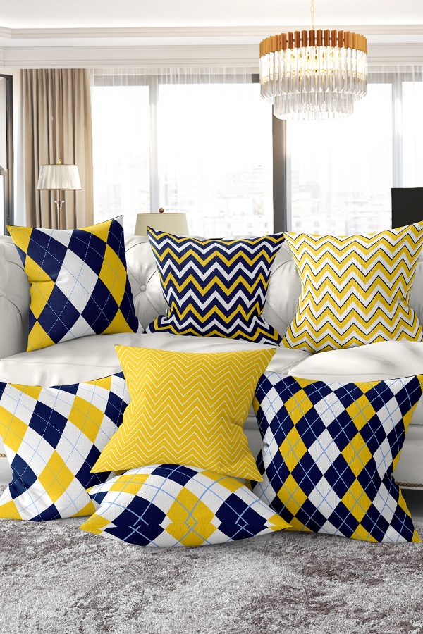 7’li Sarı & Lacivert Geometrik Çizimli Dijital Baskılı Kırlent Kılıfı Seti