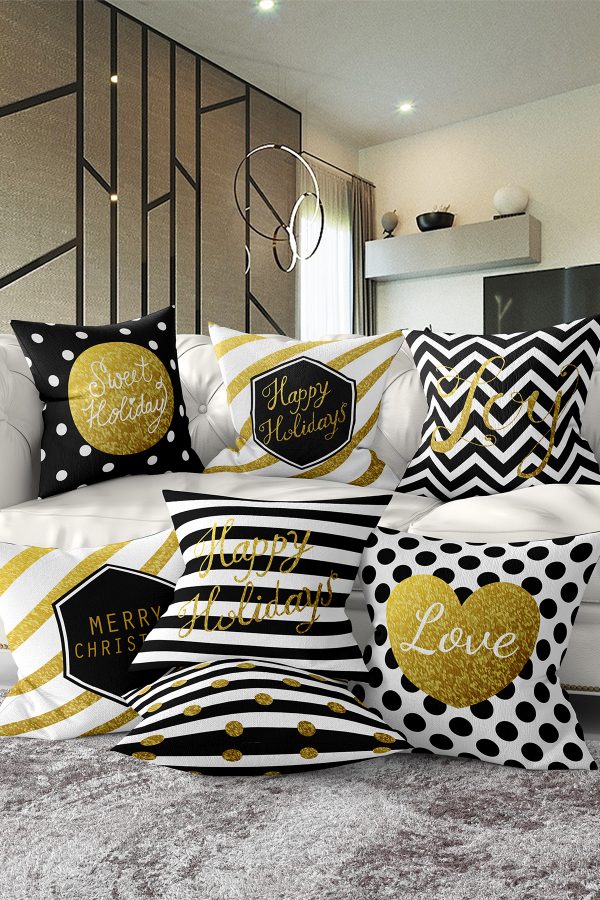 7’li Siyah Beyaz Gold Detaylı Mery Christmas Tasarımlı Dijital Baskılı Kırlent Kılıfı Seti