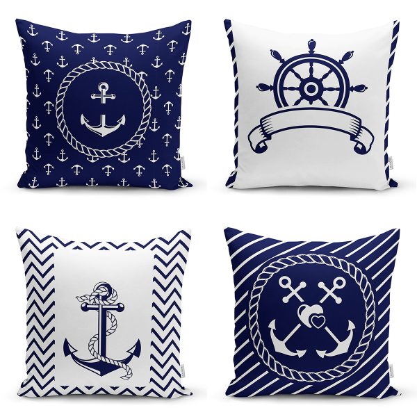 4lü Lacivert Beyaz Çapa Tasarımlı Dekoratig Yastık Kırlent Kılıf Seti