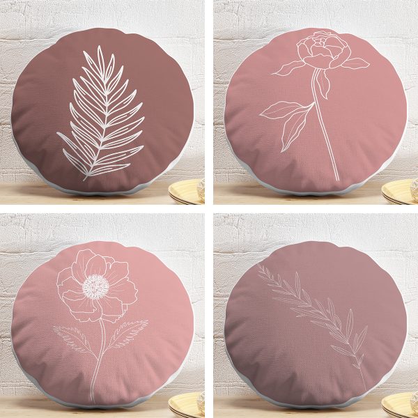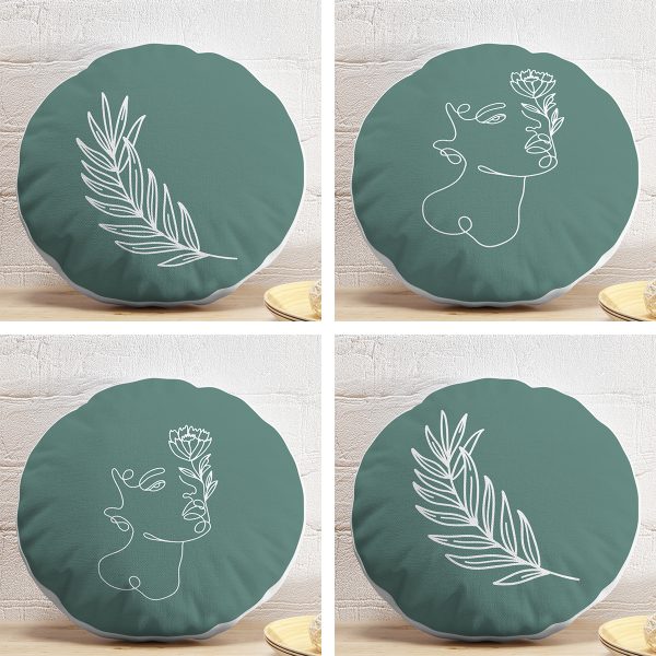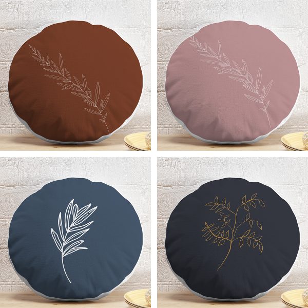 4’lü Renkli Zemin Üzerinde Onedraw Çizimli Yaprak Desenli Modern Yuvarlak Yastık Kırlent Kılıf Seti