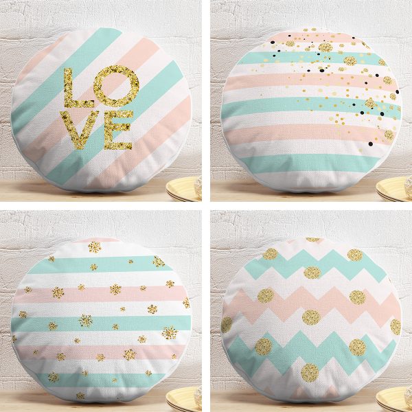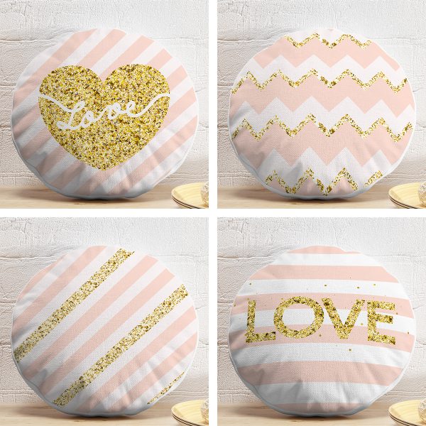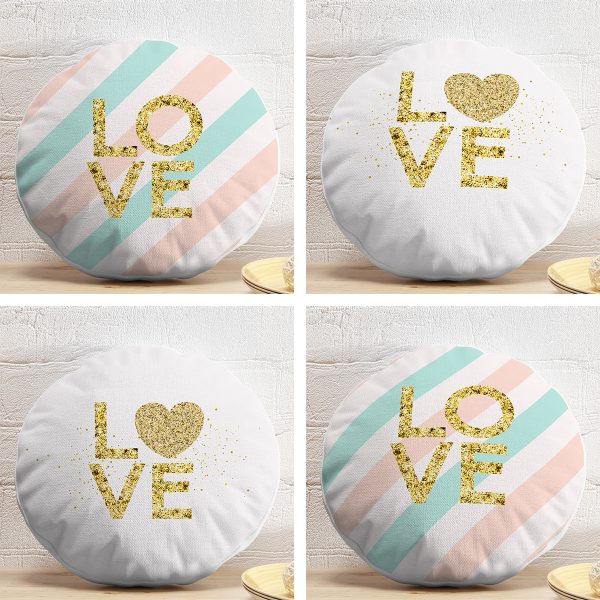 4’lü Renkli Zemin Üzerinde Gold Detaylı Love Yazılı Modern Yuvarlak Yastık Kırlent Kılıf Seti