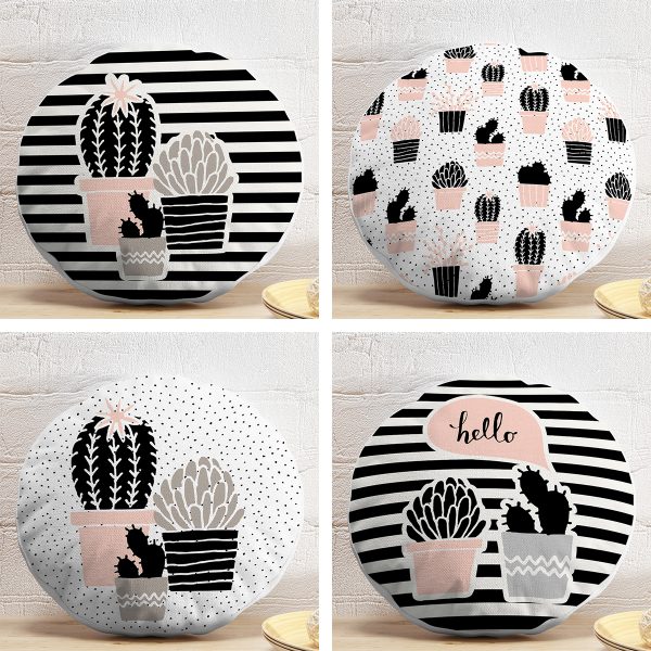 4’lü Beyaz Zemin Üzerinde Kaktüs Desenli Modern Yuvarlak Yastık Kırlent Kılıf Seti
