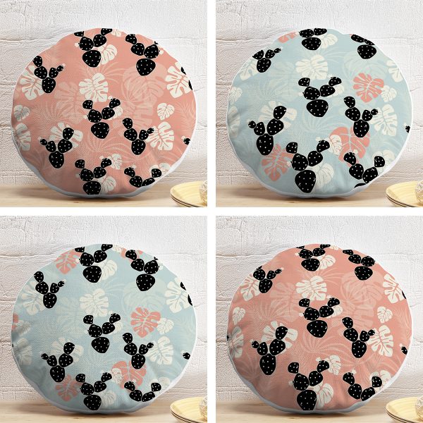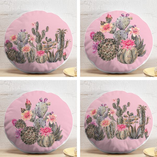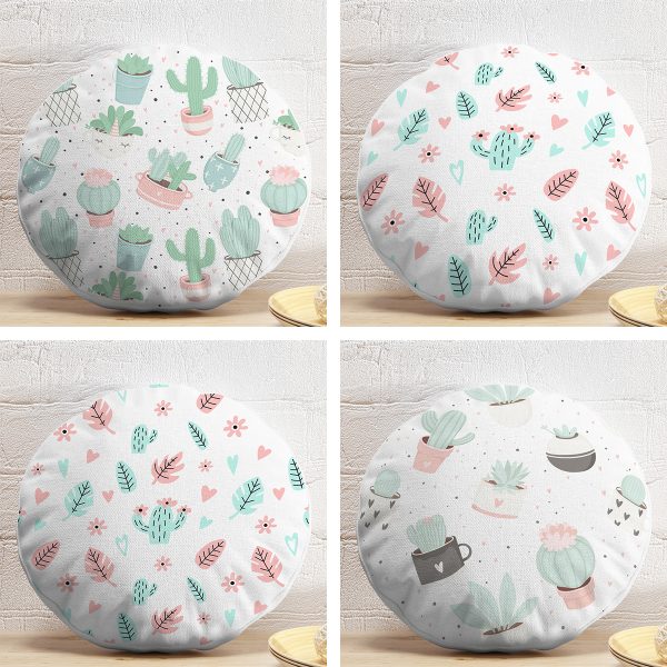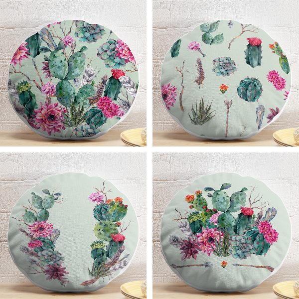 4’lü Renkli Zemin Üzerinde Kaktüs Desenli Modern Yuvarlak Yastık Kırlent Kılıf Seti