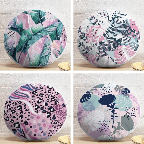 4’lü Renkli Zemin Yaprak Desenli Modern Yuvarlak Yastık Kırlent Kılıf Seti
