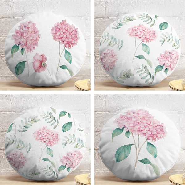 4’lü Beyaz Zemin Üzerinde Ortanca Çiçeği Desenli Modern Yuvarlak Yastık Kırlent Kılıf Seti