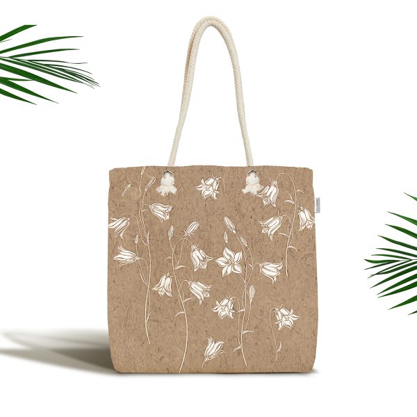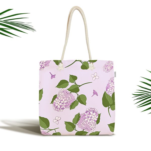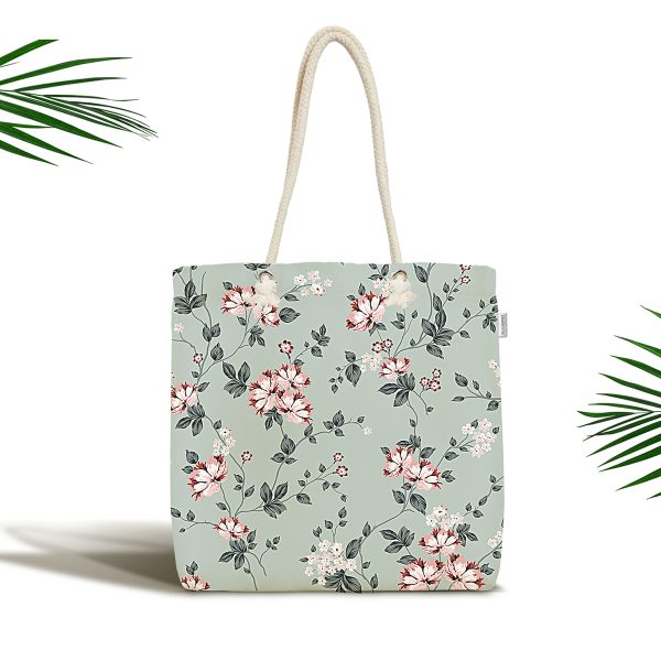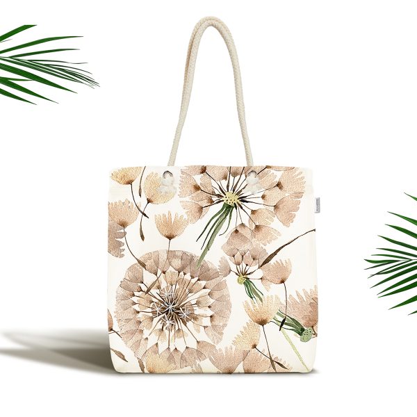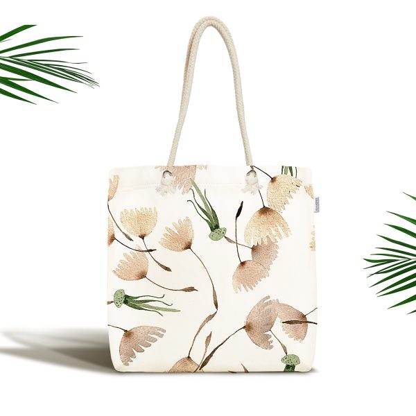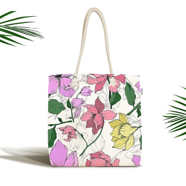 Beyaz Zemin Üzerinde Çiçek Desenli Dijital Baskılı Kumaş Plaj Çantası