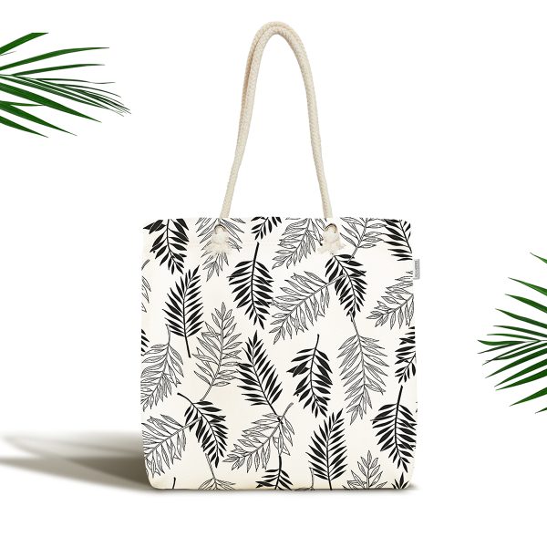Beyaz Zemin Üzerinde Siyah Yaprak Desenli Dijital Baskılı Kumaş Plaj Çantası