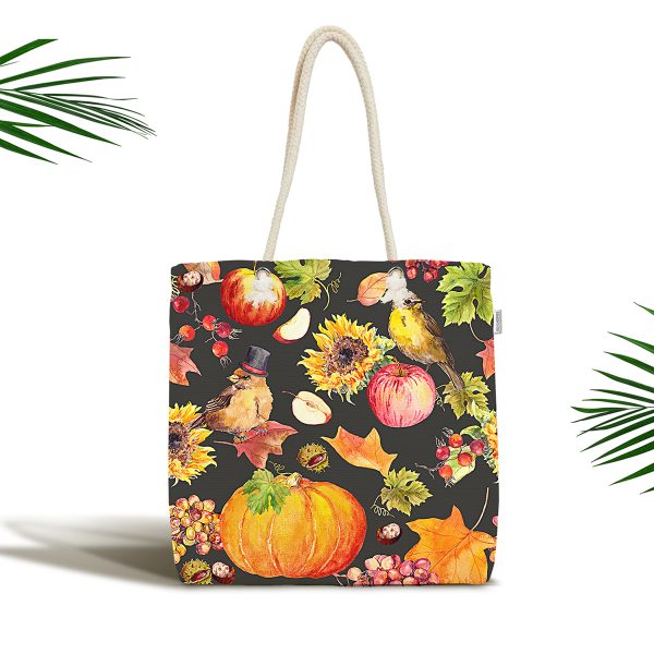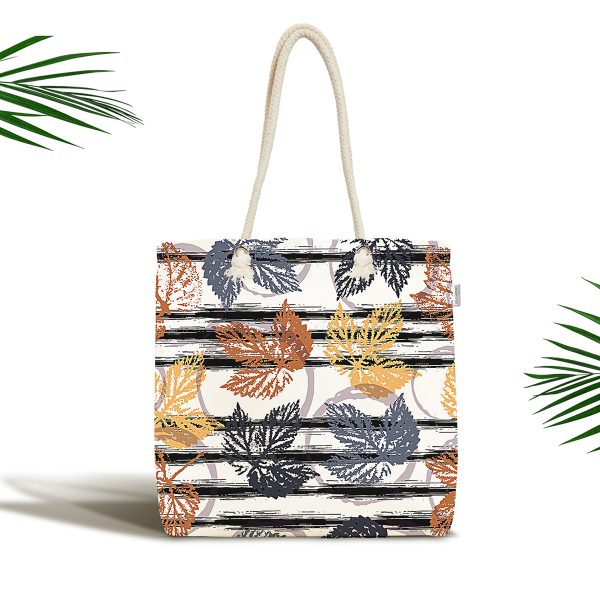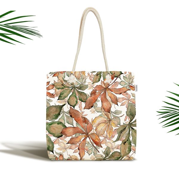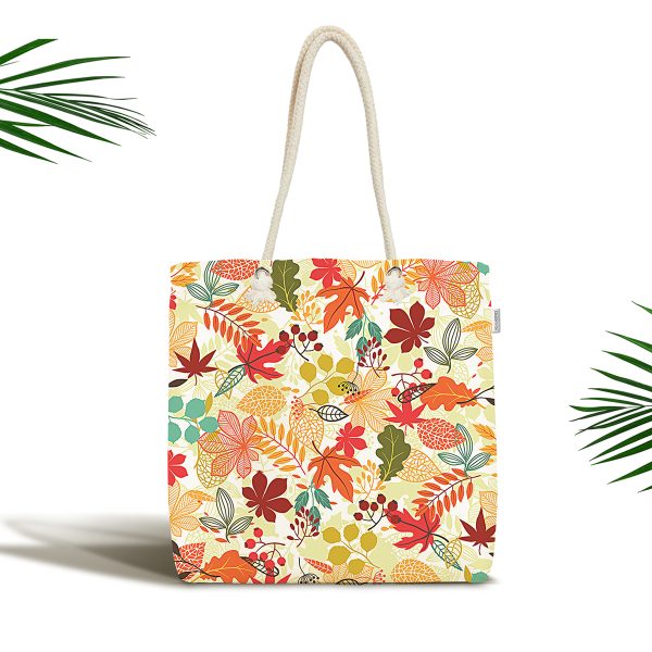 Sonbahar Temalı Yaprak Figürlü Dijital Baskılı Kumaş Plaj Çantası