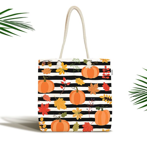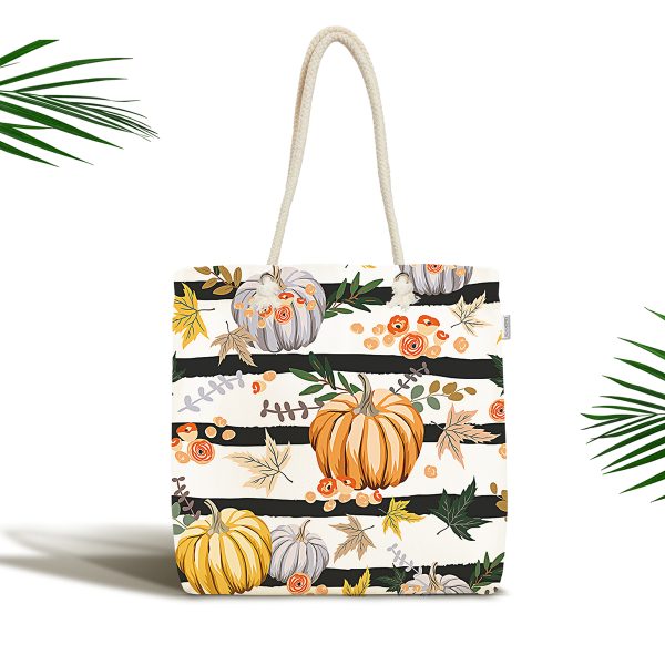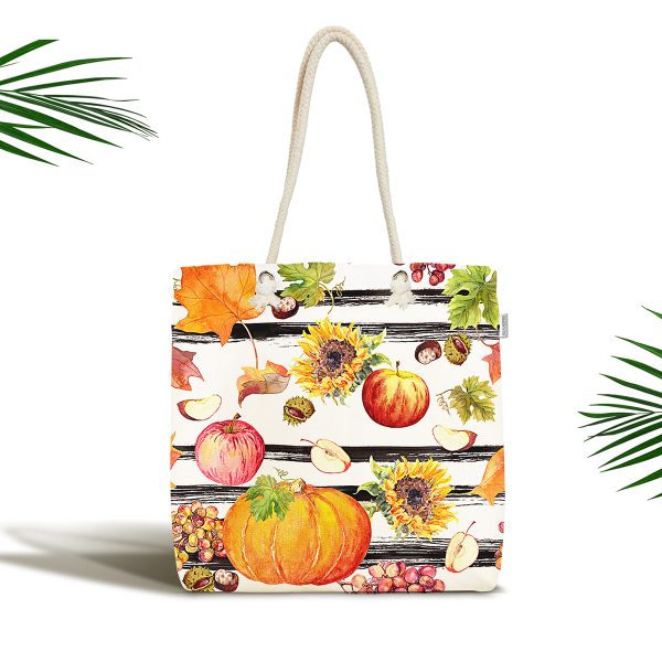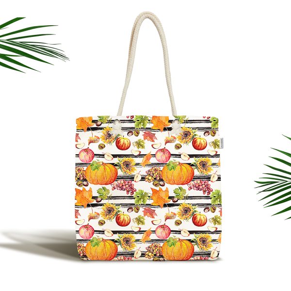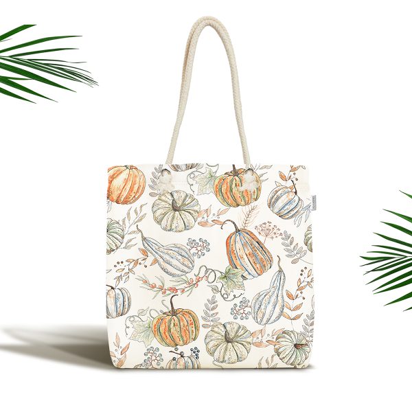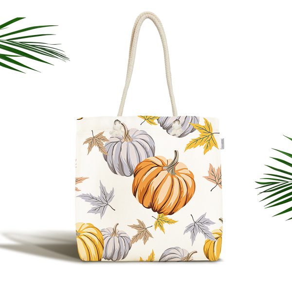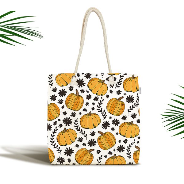 Beyaz Zemin Üzerinde Renkli Balkabağı Desenli Dijital Baskılı Kumaş Plaj Çantası