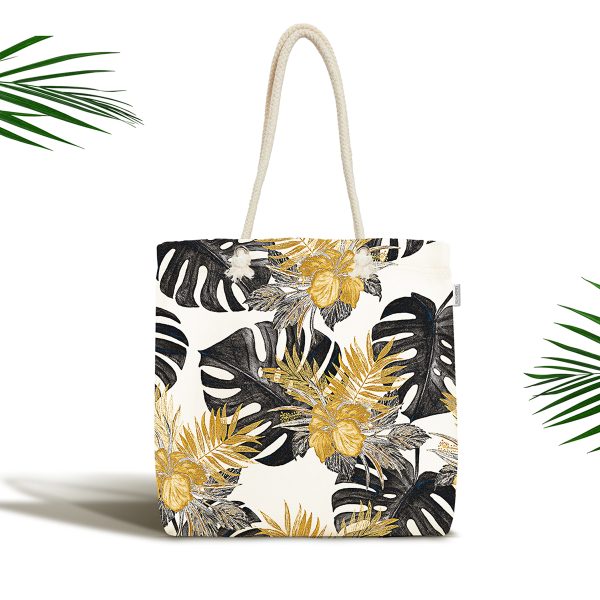 Beyaz Zemin Üzerinde Gold Detaylı Siyah Yaprak Desenli Dijital Baskılı Kumaş Plaj Çantası