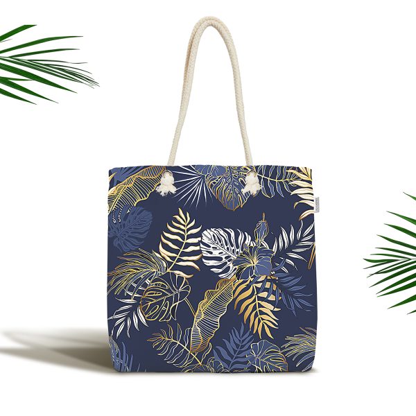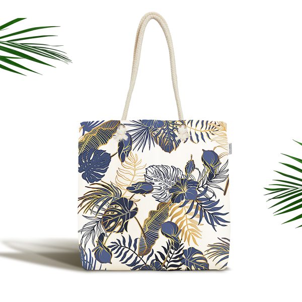 Mavi Zemin Üzerinde Gold Detaylı Yaprak Desenli Dijital Baskılı Kumaş Plaj Çantası