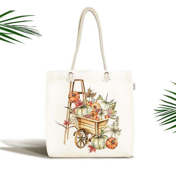 Beyaz Zemin Üzerinde Bal Kabağı Desenli Dijital Baskılı Kumaş Plaj Çantası