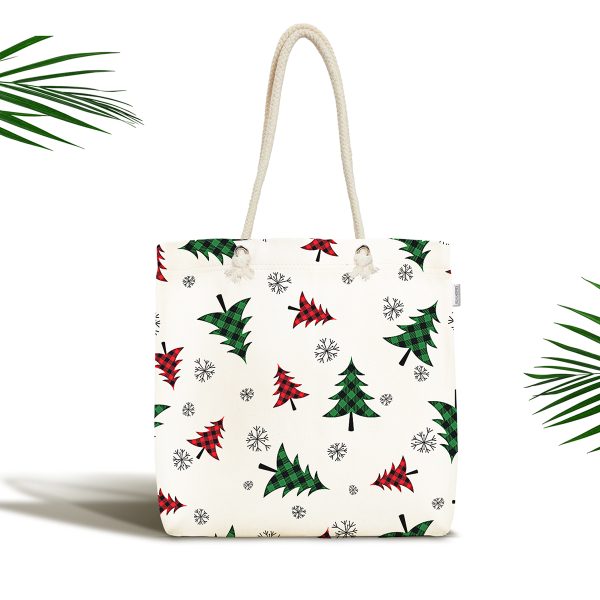 Beyaz Zemin Üzerinde Ekoseli Çam Ağacı Desenli Dijital Baskılı Kumaş Plaj Çantası