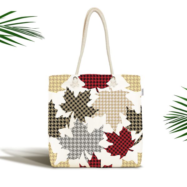 Beyaz Zemin Üzerinde Ekoseli Sonbahar Yaprak Desenli Dijital Baskılı Kumaş Plaj Çantası