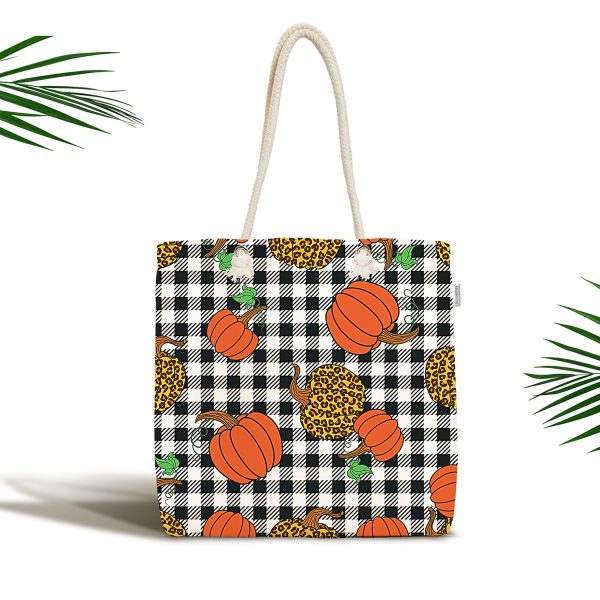 Siyah Beyaz Ekose Üzerinde Renkli Balkabağı Desenli Dijital Baskılı Kumaş Plaj Çantası