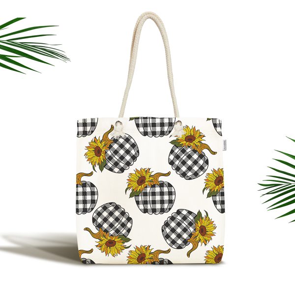 Beyaz Zemin Üzerinde Ekose Desenli Bal Kabağı Motifli Dijital Baskılı Kumaş Plaj Çantası