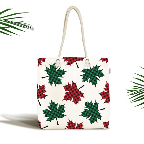 Beyaz Zemin Üzerinde Ekoseli Yaprak Desenli Dijital Baskılı Kumaş Plaj Çantası