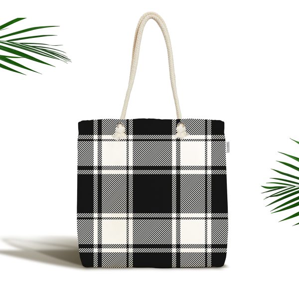 Beyaz Zemin Üzerinde Siyah Ekose Desenli Dijital Baskılı Kumaş Plaj Çantası