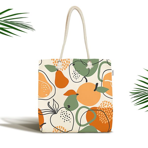 Renkli Zemin Üzerinde Onedraw Çizimli Meyve Desenli Dijital Baskılı Kumaş Plaj Çantası