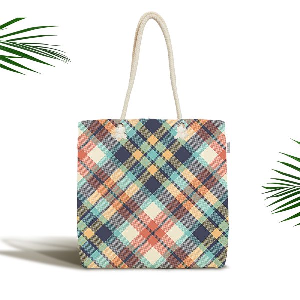 Renkli Zemin Üzerinde Pastel Renkli Ekose Desenli Dijital Baskılı Kumaş Plaj Çantası