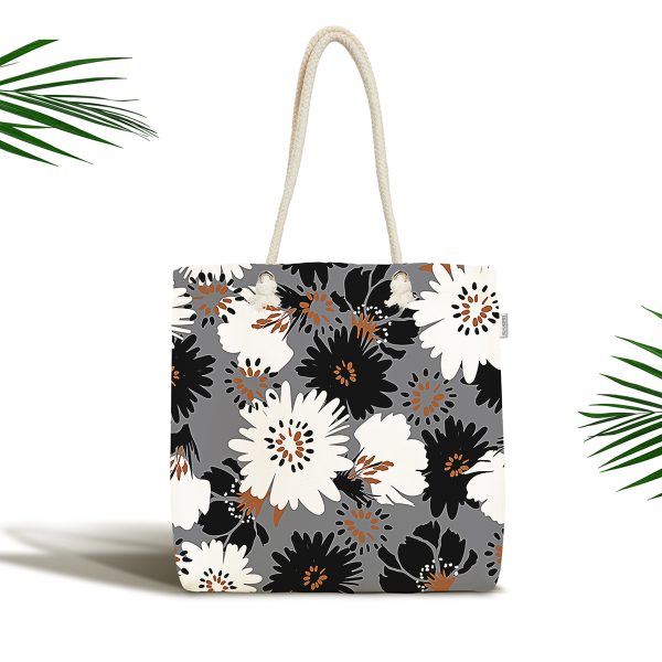 Rengarenk Zemin Üzerinde Siyah Beyaz Çiçek Desenli Dijital Baskılı Kumaş Plaj Çantası