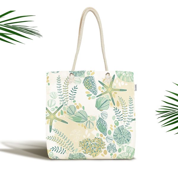 Beyaz Zemin Üzerinde Deniz Yıldızı Desenli Dijital Baskılı Kumaş Plaj Çantası