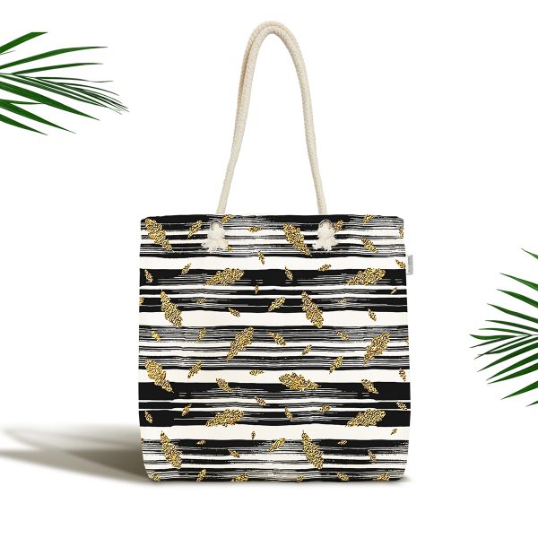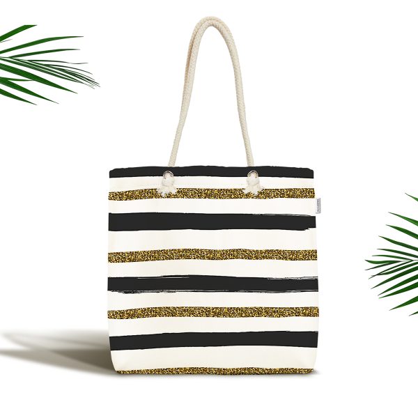 Beyaz Zeminde Gold Ve Siyah Çizgili Dijital Baskılı Kumaş Plaj Çantası