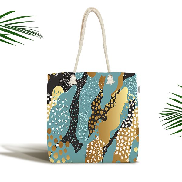 Renkli Zeminde Gold Detaylı Dijital Baskılı Kumaş Plaj Çantası