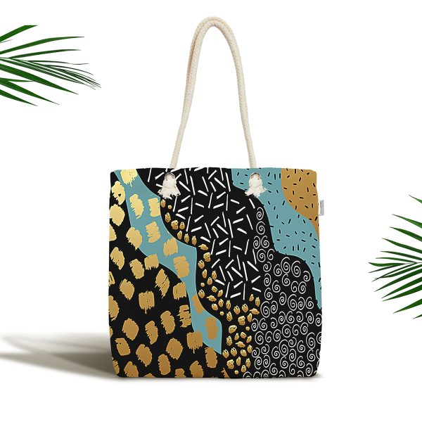 Siyah Beyaz Zeminde Gold Detaylı Renkli Çizim Dijital Baskılı Kumaş Plaj Çantası